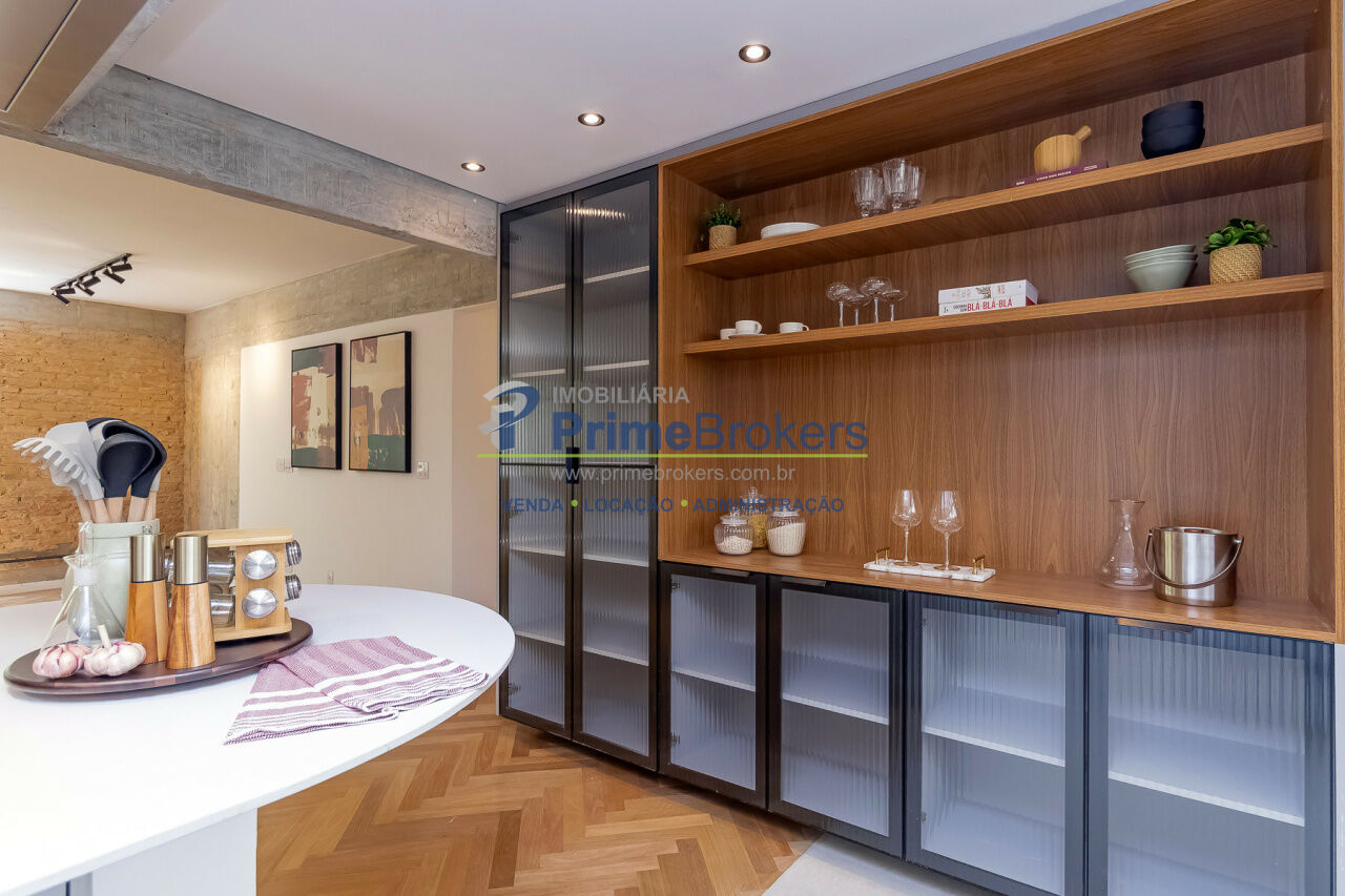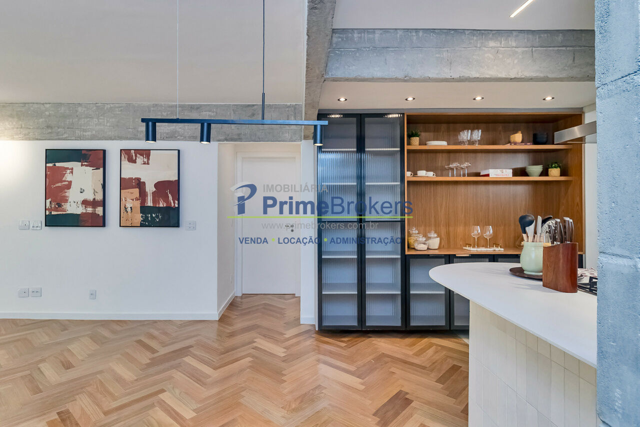 Apartamento no Jardim Paulista de 115m², 3 quartos sendo 1 suíte e 1 vaga de garagem, sala com 2 ambientes, sala de jantar e sala de TV, cozinha americana com armários.