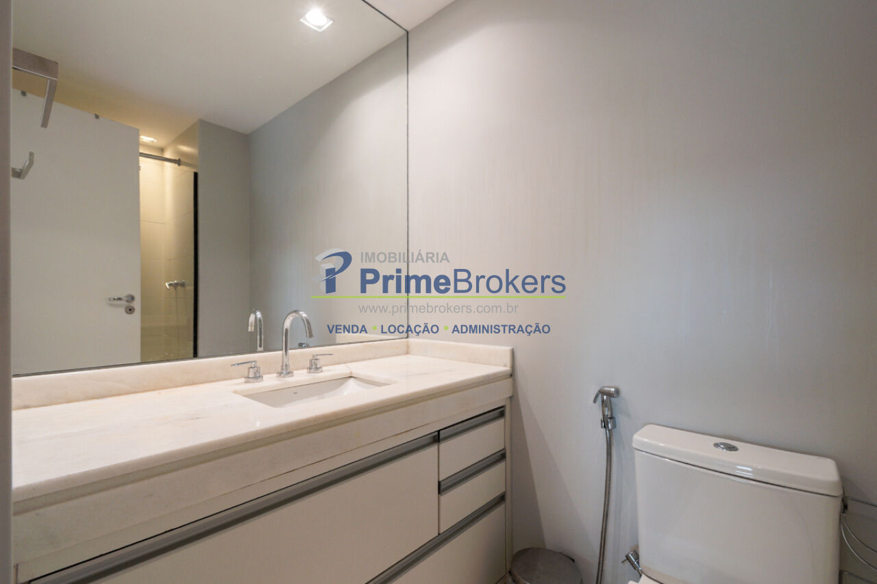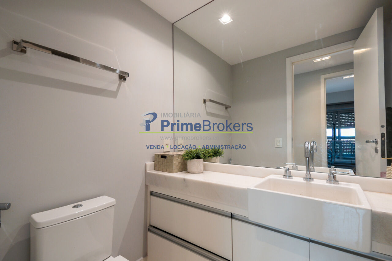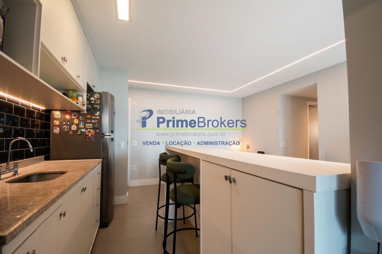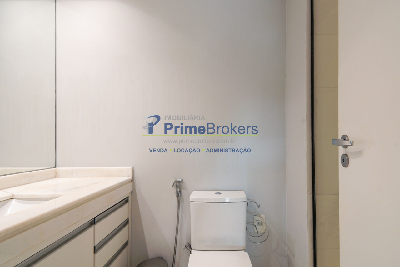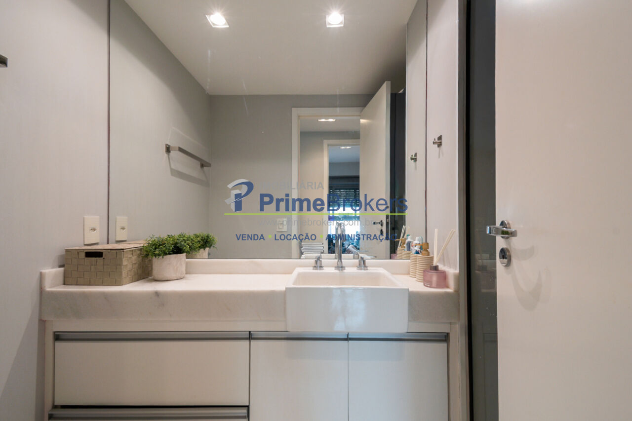 1 suíte, sacada, lavabo, área de serviço, móveis planejados, ar condicionado central, água quente, gás encanado, hall privativo, elevador privativo, vista permanente, alarme, mobiliado