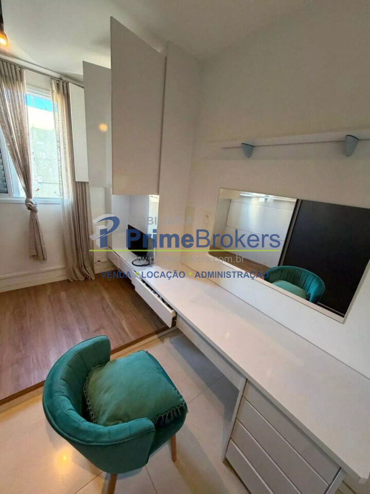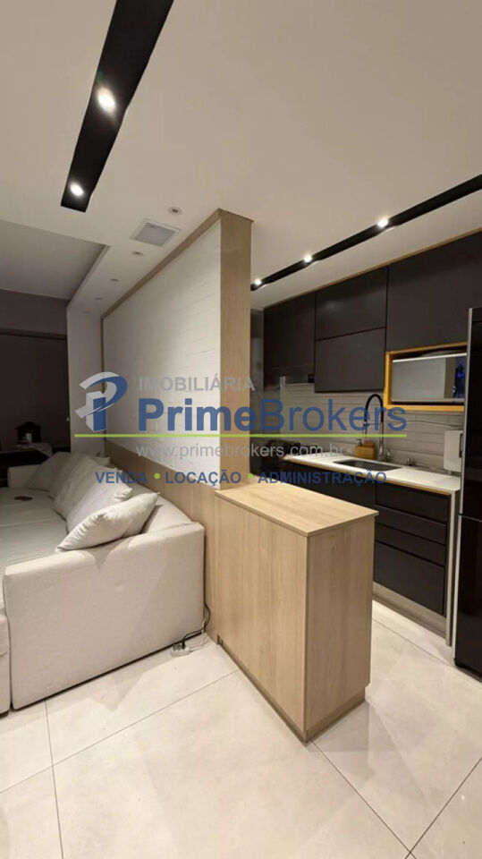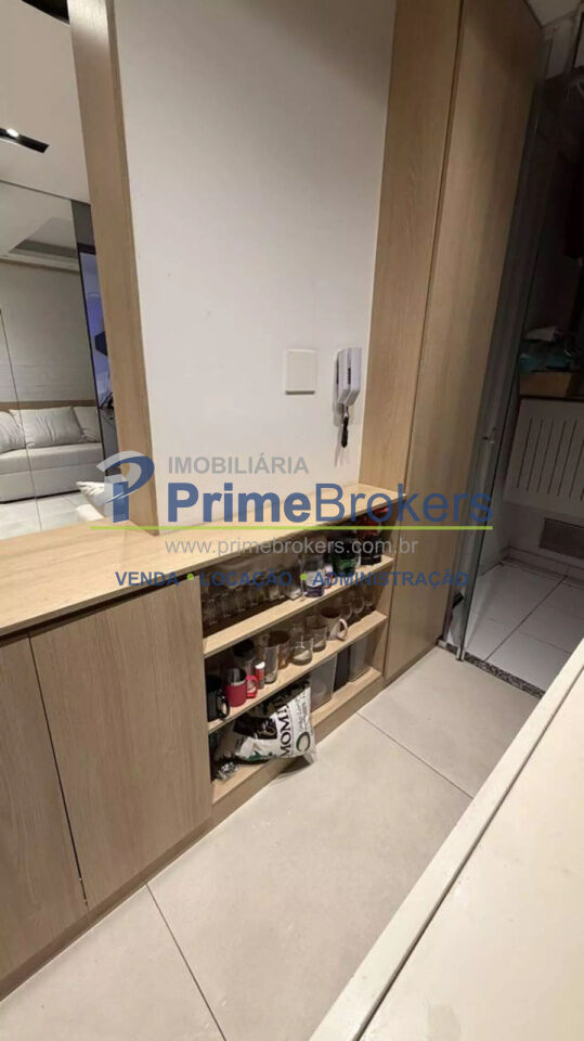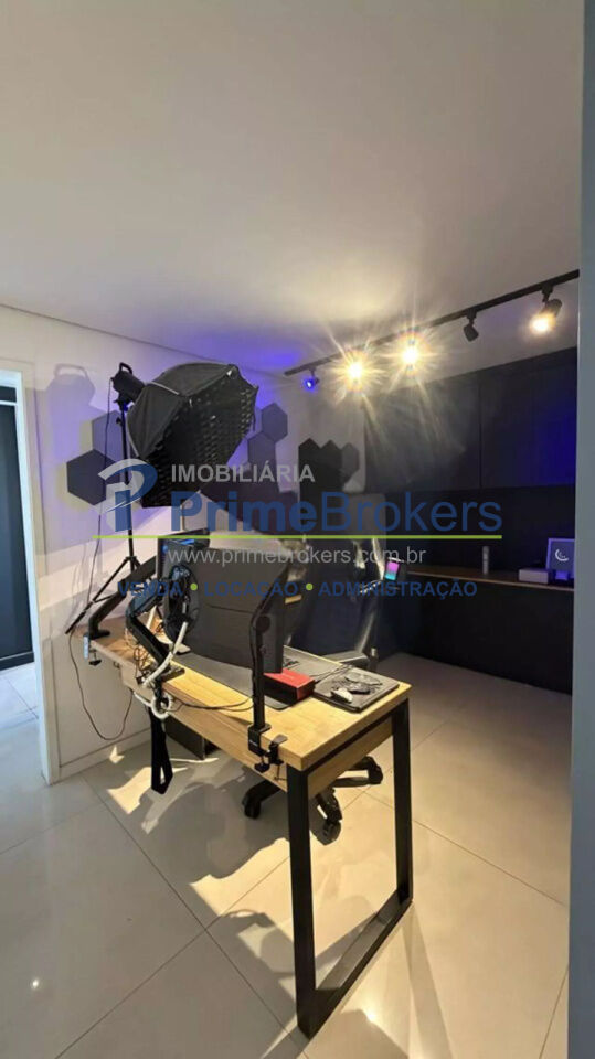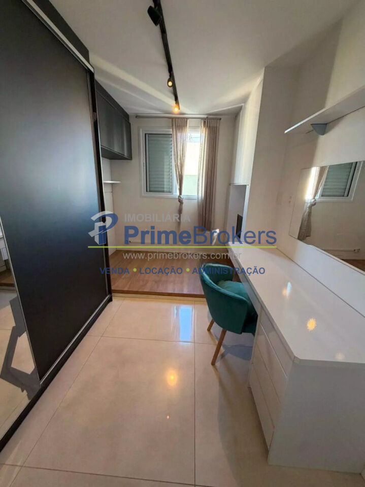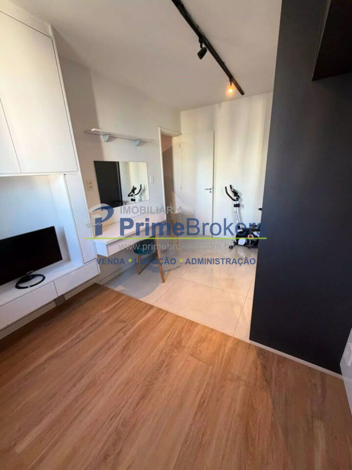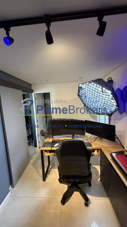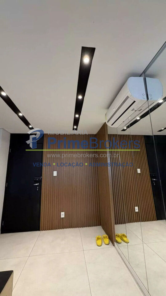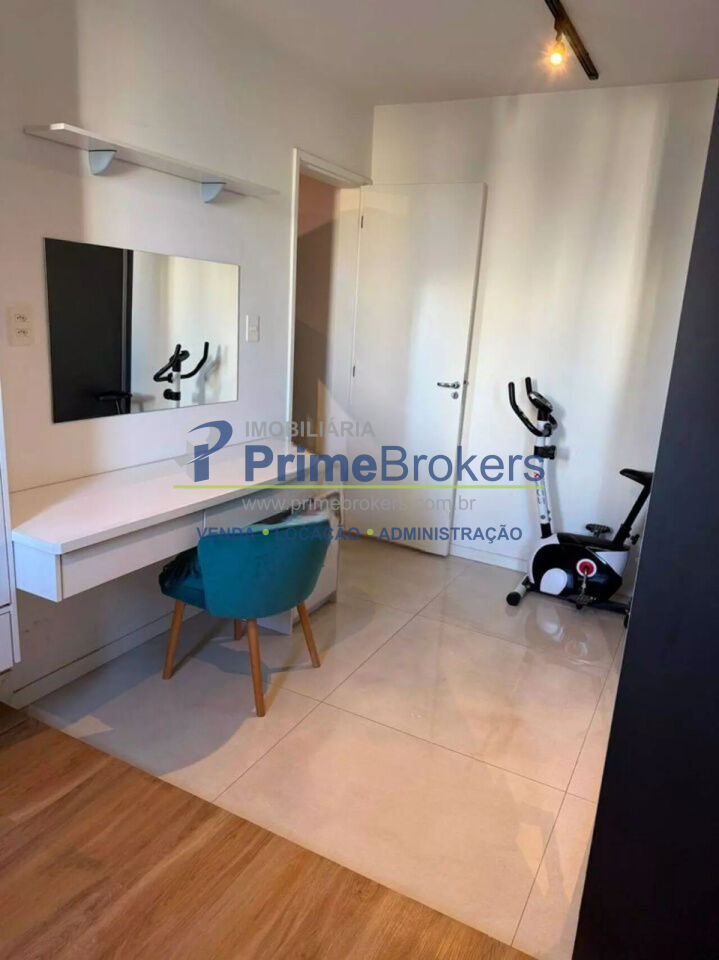 O imóvel conta com 2 quartos, sendo um deles configurado como escritório, além de 1 banheiro e 1 vaga de garagem. Possui ainda ar-condicionado, armários embutidos amplos com espelho, penteadeira e um escritório minimalista, tornando o apartamento ainda mais versátil e bem aproveitado.