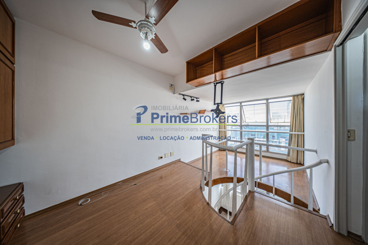 Duplex na Vila Clementino com 55m², mezanino com suíte completa, closet, home office e banheiro. Primeiro pavimento com living, lavabo e cozinha americana. Móveis planejados, água quente, janela teto-chão e vista para cidade. 1 vaga coberta.