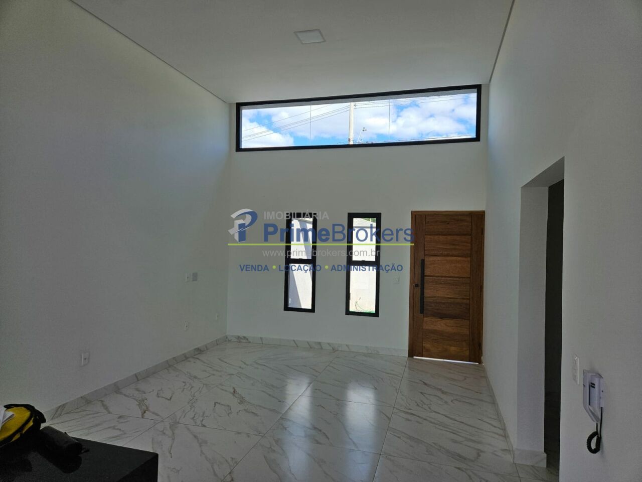 Sala com pé-direito duplo, proporcionando amplitude e iluminação natural