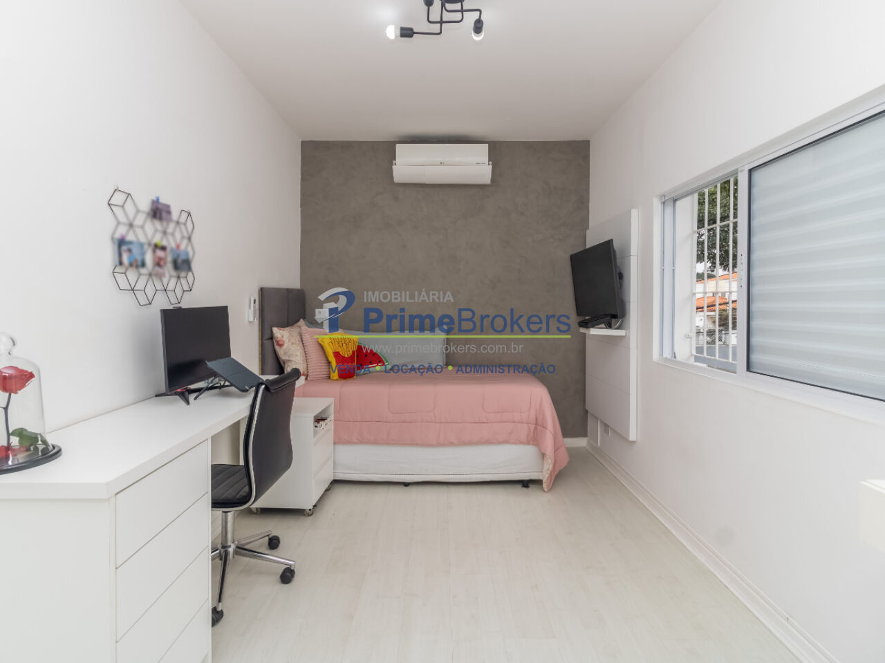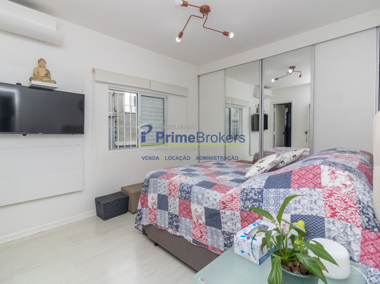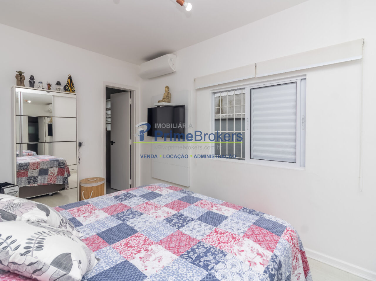 Dormitórios generosos, com armários planejados em madeira e ar-condicionado