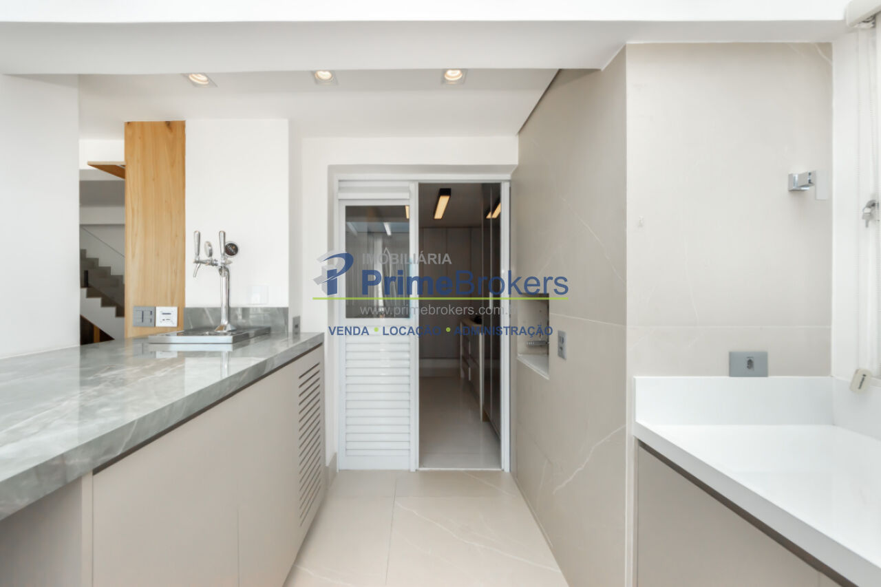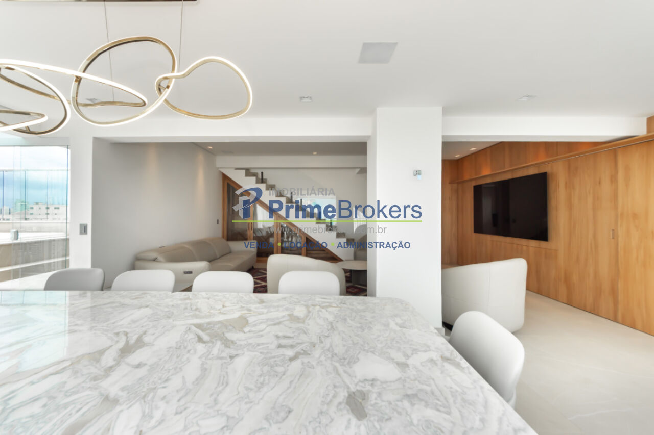 Terraço com jacuzzi exclusiva, 3 suítes (uma com varanda e closet), duplex, mobiliado, móveis planejados, piso porcelanato, vista panorâmica, varanda circundante, adega climatizada, ofurô, closet, aquecimento solar e central