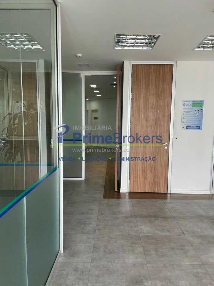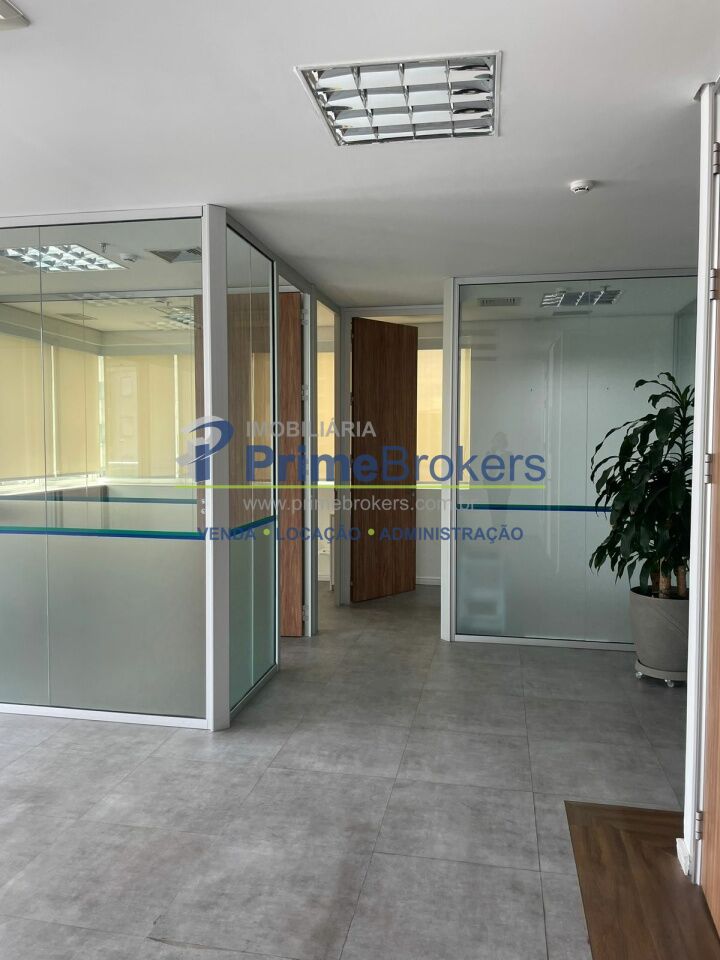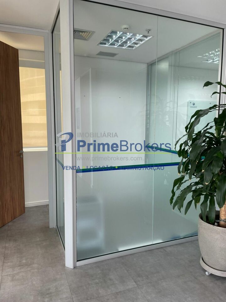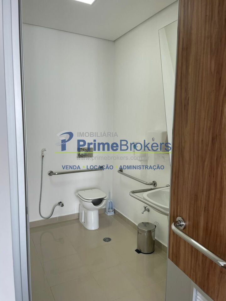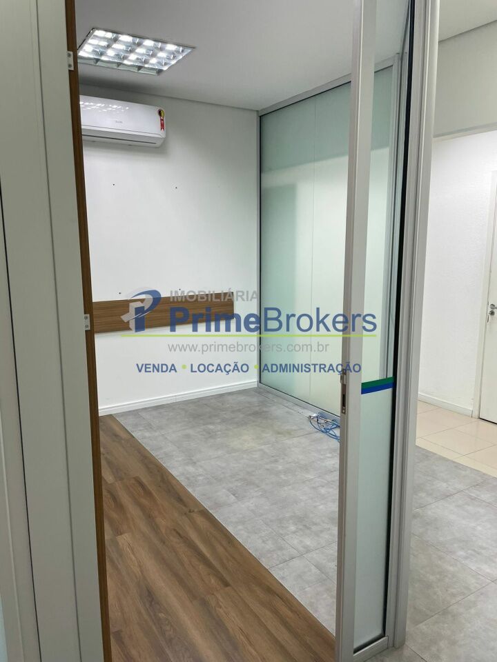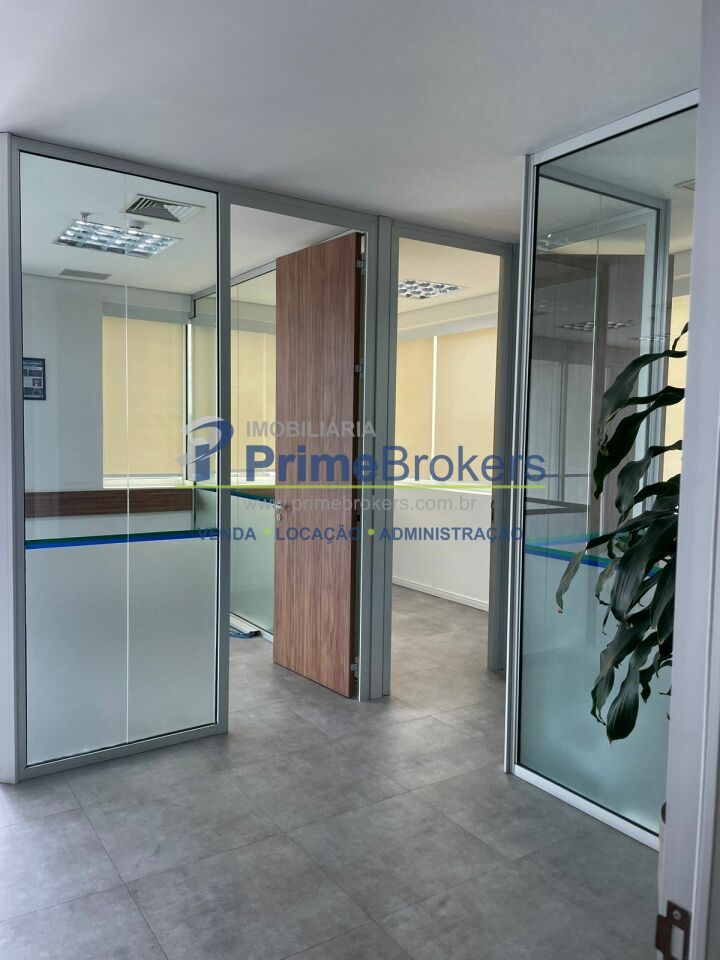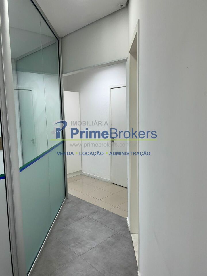 O espaço está dividido em vidro, oferecendo 6 salas independentes, além de recepção, copa, varanda e área técnica para ar-condicionado. Conta com 2 banheiros (masculino e feminino), 1 banheiro adaptado para PCD, e um pequeno depósito na garagem.