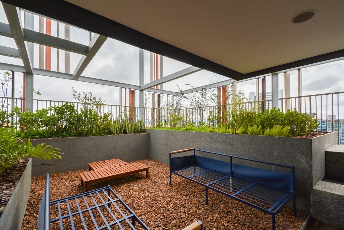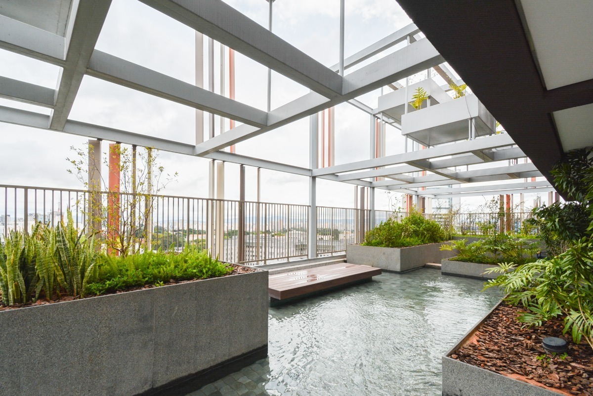 Paisagismo exuberante e áreas para contemplação da vista do jardins.