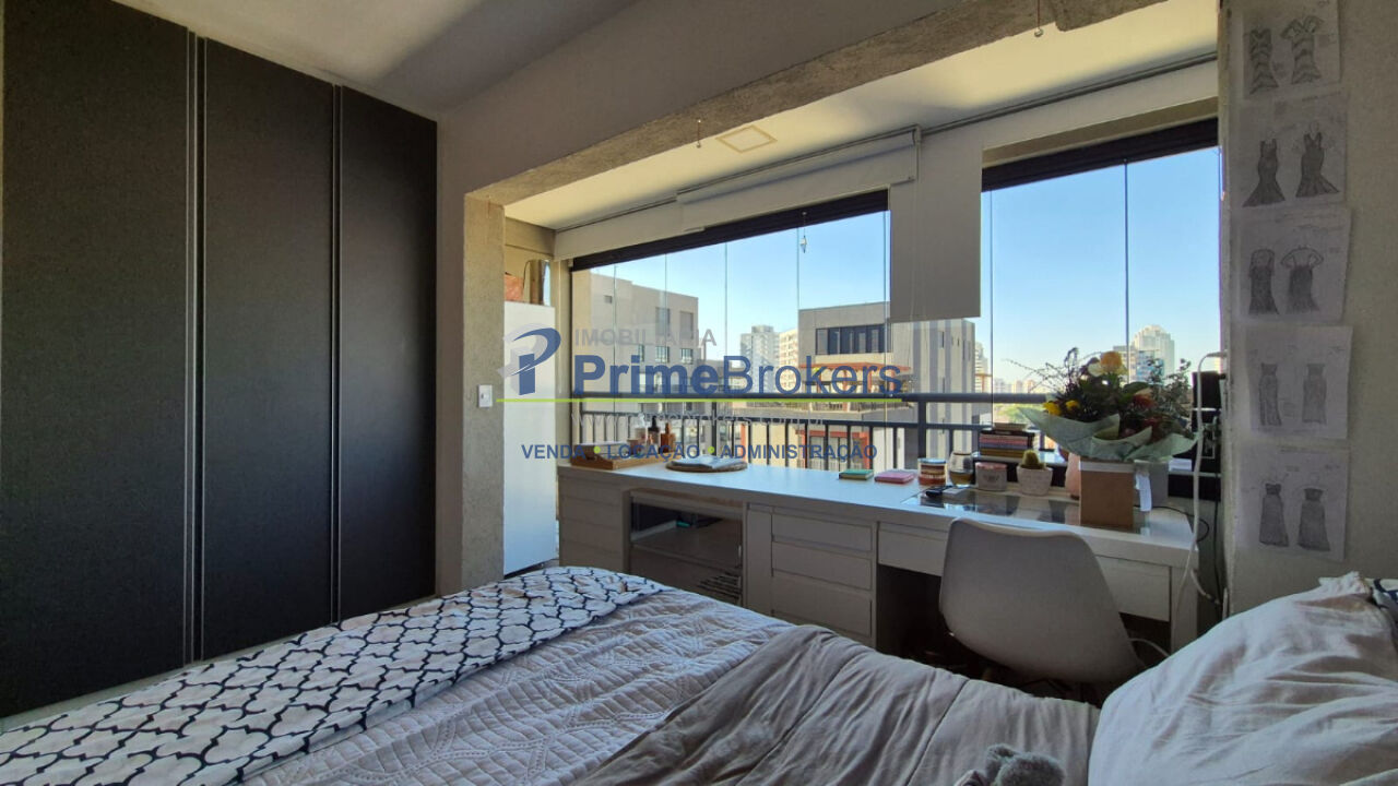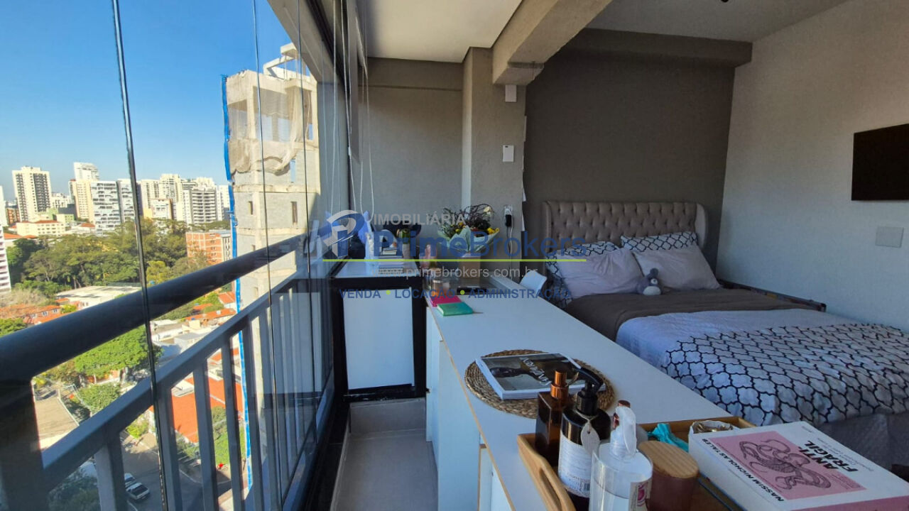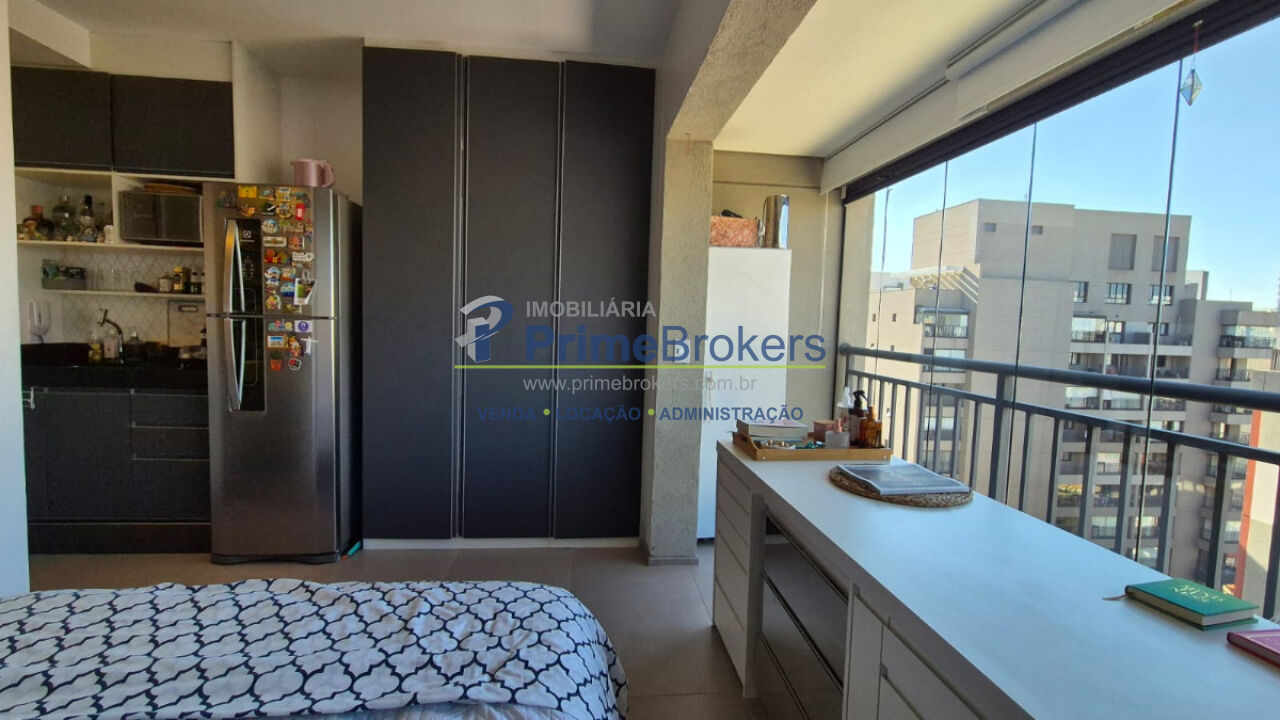 Studio, varanda integrada, armários embutidos, ar condicionado, piso porcelanato, banheiro com ventilação natural, aquecimento central, andar alto com sol da manhã