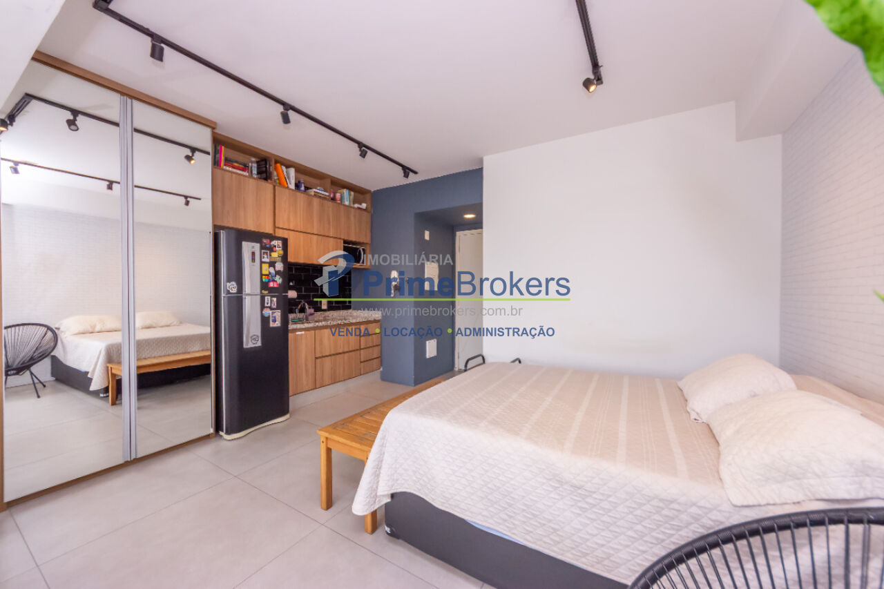 Studio com 1 suíte, mobiliado e equipado, cozinha integrada, home office, móveis planejados, piso vinílico, janelas teto-chão, vista panorâmica para cidade, infraestrutura para ar-condicionado, água quente, 1 vaga de garagem
